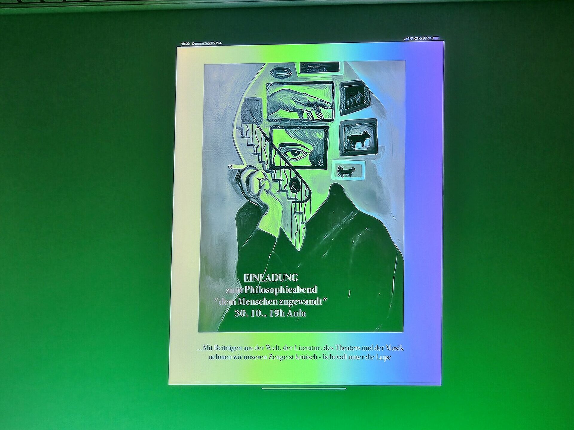 Mit „Dem Menschen zugewandt“ fand am 30. Oktober ein philosophischer Abend in der Aula des Friedrich-Dessauer-Gymnasiums statt. Unter der Leitung von Julia Grundner, die bereits im Jahr zuvor durch einen „interkulturellen Abend“ führte, boten Schülerinnen und Schüler, Lehrkräfte und Eltern gemeinsam ein buntes Werk von Kunst, Musik, Literatur und Schauspiel auf.