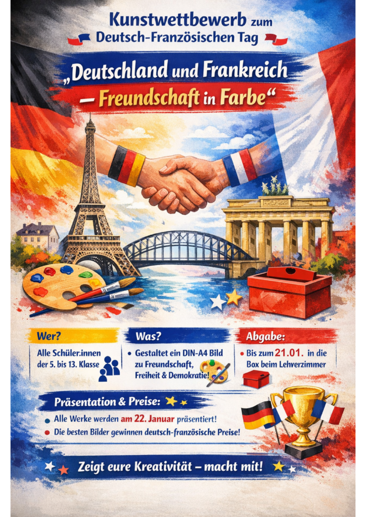 Im Namen der Fachschaft Französisch laden wir euch herzlich zum diesjährigen Deutsch-Französischen Tag am Donnerstag, dem 22.01.2026, ein.