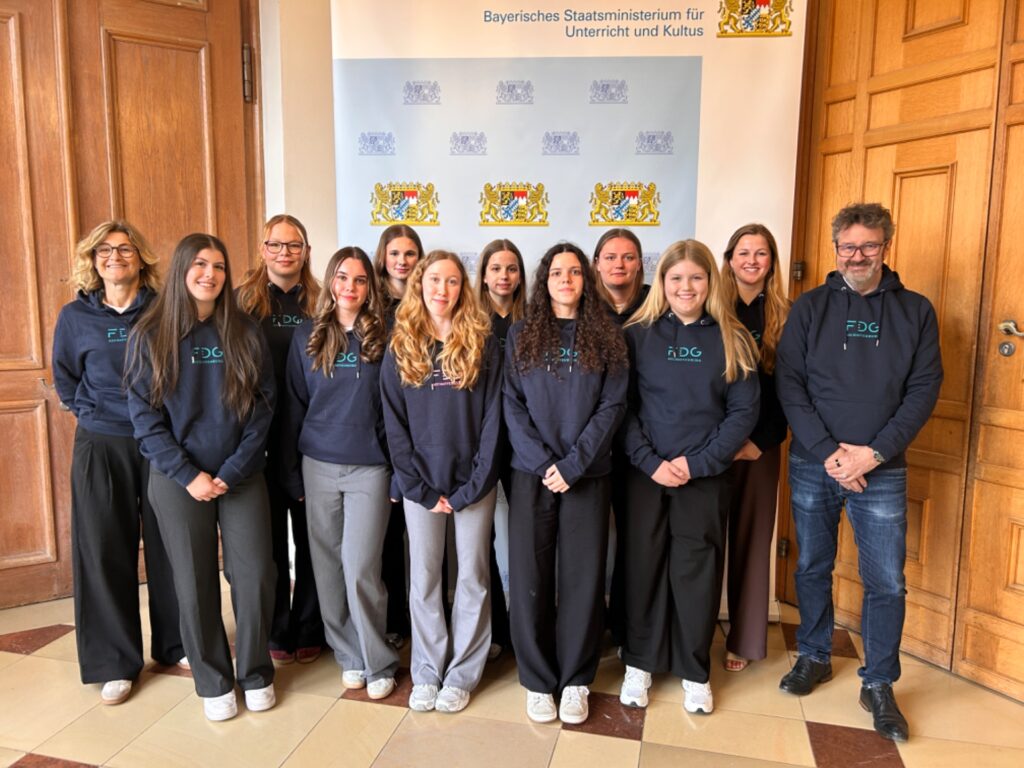 In einem festlichen Rahmen sind am Mittwoch, 25.03.2026, die erfolgreichen Schwimmerinnen unserer Schule in der Münchner Residenz ausgezeichnet worden. Bildungsministerin Anna Stolz würdigte die jungen Athletinnen für ihren herausragenden Sieg beim Rhein-Main-Donau-Schulwettbewerb, den sie bereits im Mai 2025 in Heilbronn mit großem Vorsprung für sich entscheiden konnten.