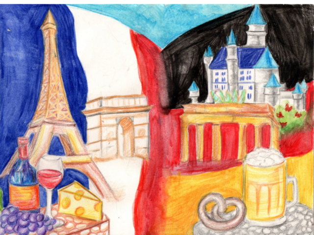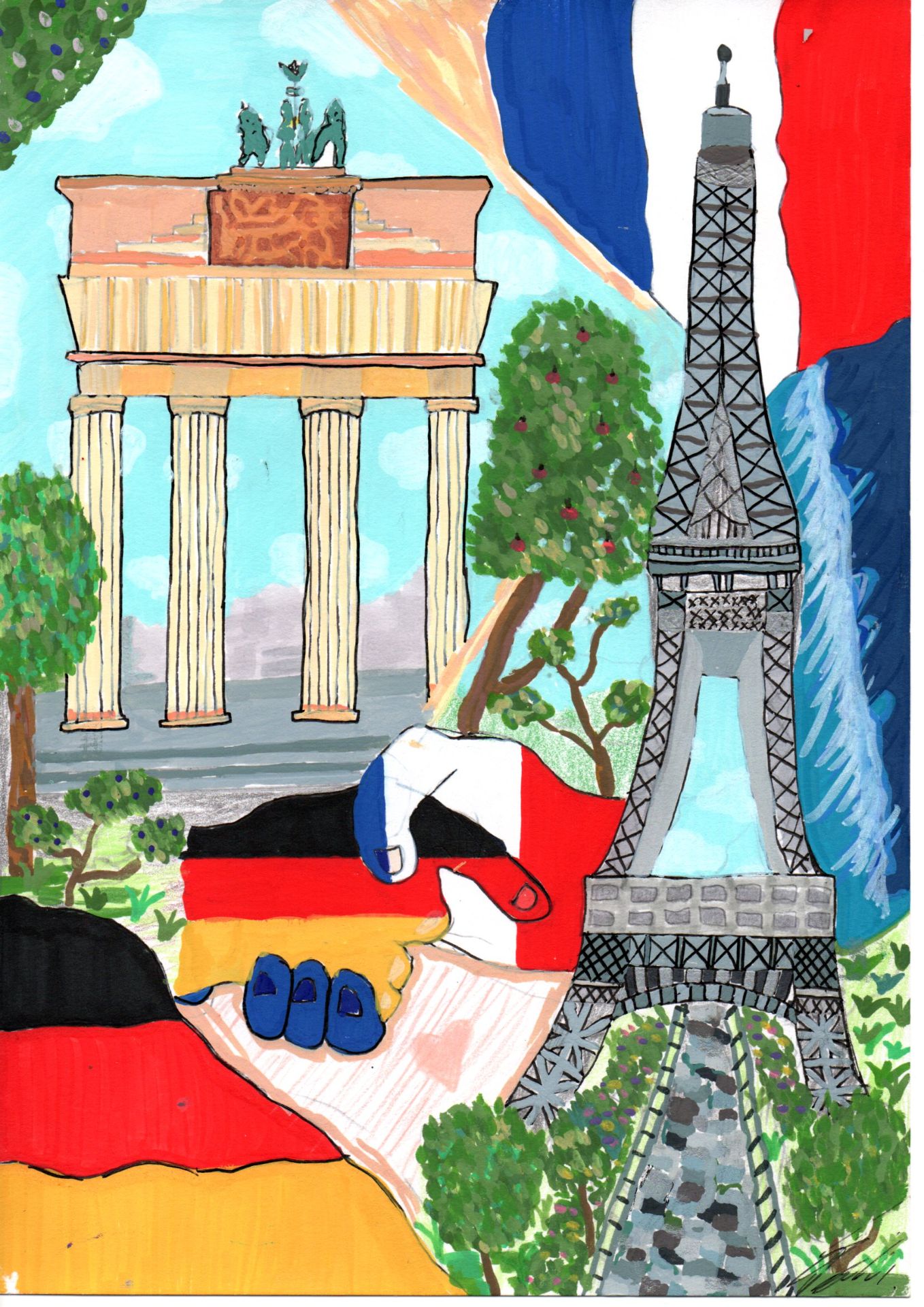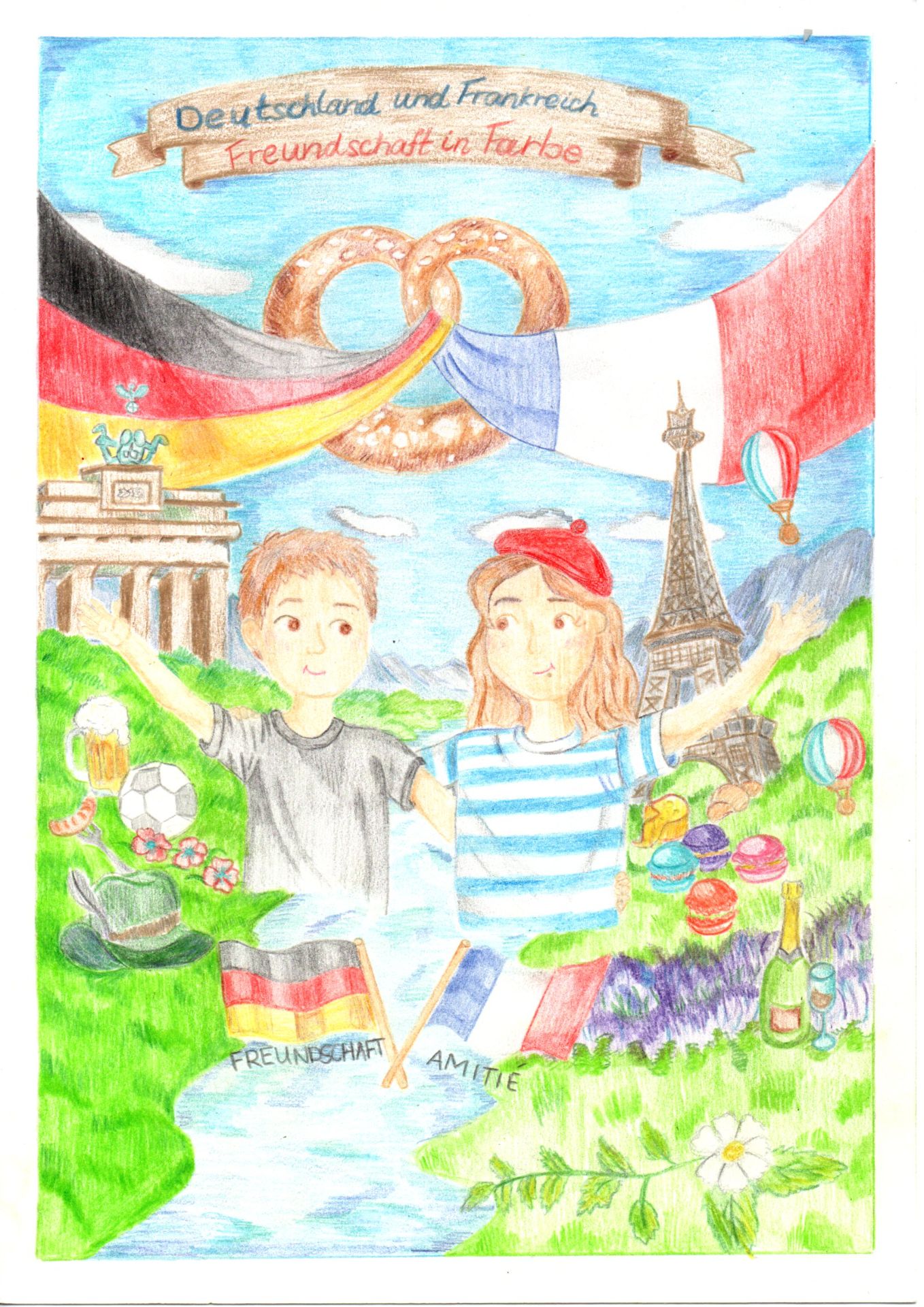 Ein weiterer Höhepunkt war der Kunstwettbewerb unter dem Motto „Deutschland und Frankreich im Spiegel – Freundschaft in Farbe“. Die Jury unter der Leitung von Herrn Pignard stand vor keiner leichten Aufgabe, aus den zahlreichen gelungenen Beiträgen eine Auswahl zu treffen. Besonders überzeugen konnten schließlich drei Arbeiten: Den ersten Platz belegte Ilona Ruban aus der 10d, den zweiten Platz erreichte Ziling Ma aus der 6e und der dritte Platz ging an Leopold Killat aus der 5g. Ihre Werke setzten das Thema „Freundschaft in Farbe“ auf eindrucksvolle und sehr individuelle Weise um. Als kleines Präsent erhielten die Preisträgerinnen und Preisträger eine eigens dafür kreierte Tasche, gefüllt mit deutschen und französischen Süßigkeiten.